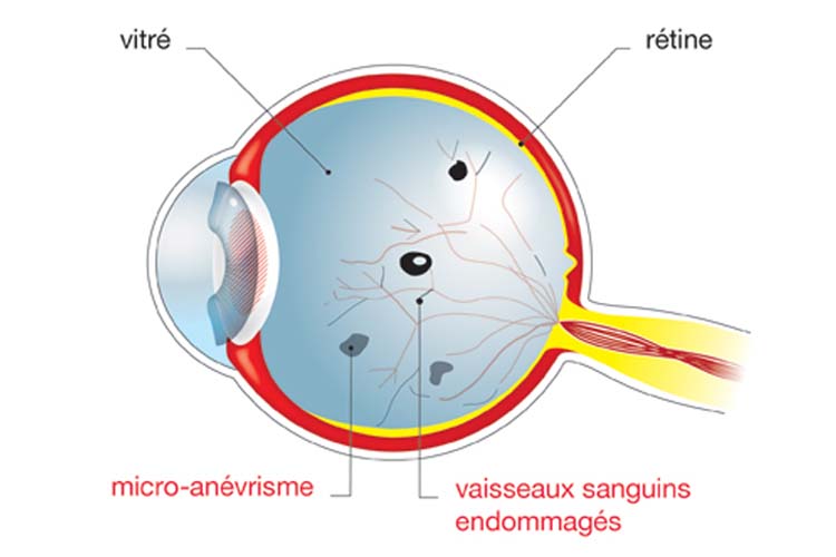 L a rétinopathie diabètique est une complication du diabète touchant les vaisseaux de la rétine , pouvant entrainer hémorragies, oedèmes et perte de vision.